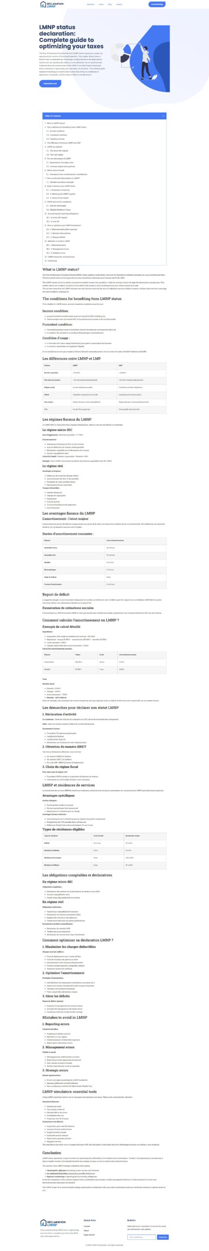 Déclaration LMNP is an online platform designed to help property owners in France who rent furnished properties (LMNP) complete their fiscal and social declarations. The client needed a website that presents a clear, trustworthy and modern service-platform for the LMNP regime: letting users upload their rental-income, expenses, amortisations, and generate legal, compliant declarations.
