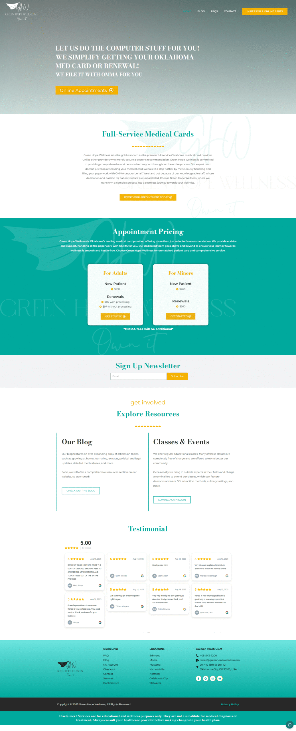 Green Hope Wellness operates as a full-service facility helping patients in Oklahoma obtain and renew medical marijuana cards. The website was created to provide a seamless online experience—from telehealth appointments to application filing—helping patients confidently navigate the OMMA (Oklahoma Medical Marijuana Authority) process.