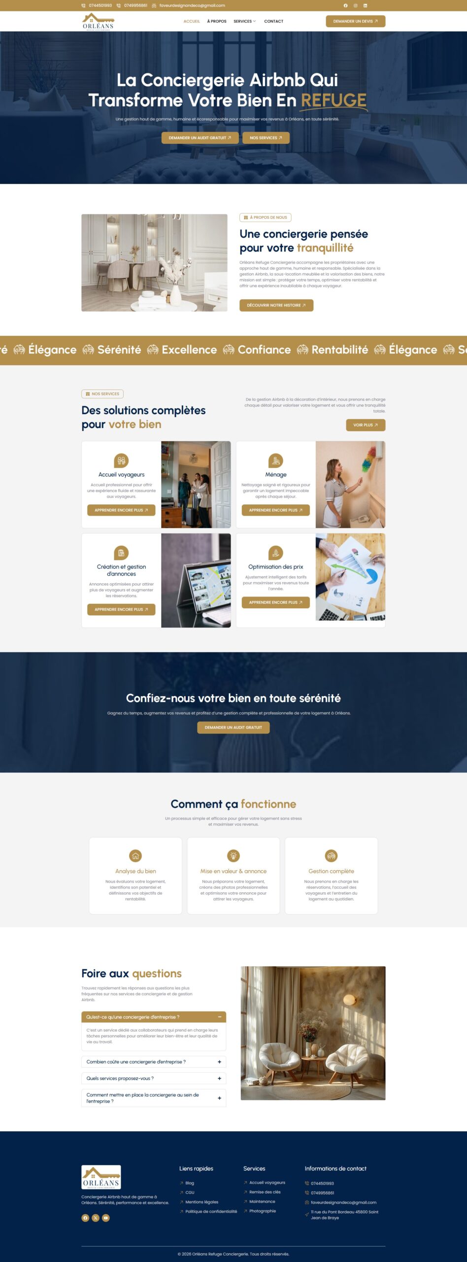 Orléans Refuge Conciergerie is a service‑oriented website developed for a French concierge business offering full‑service property management for short‑term rentals and personalized guest care. The goal was to build a clear, professional online presence that communicates the scope of services and helps property owners understand how the concierge can enhance their rental operations.