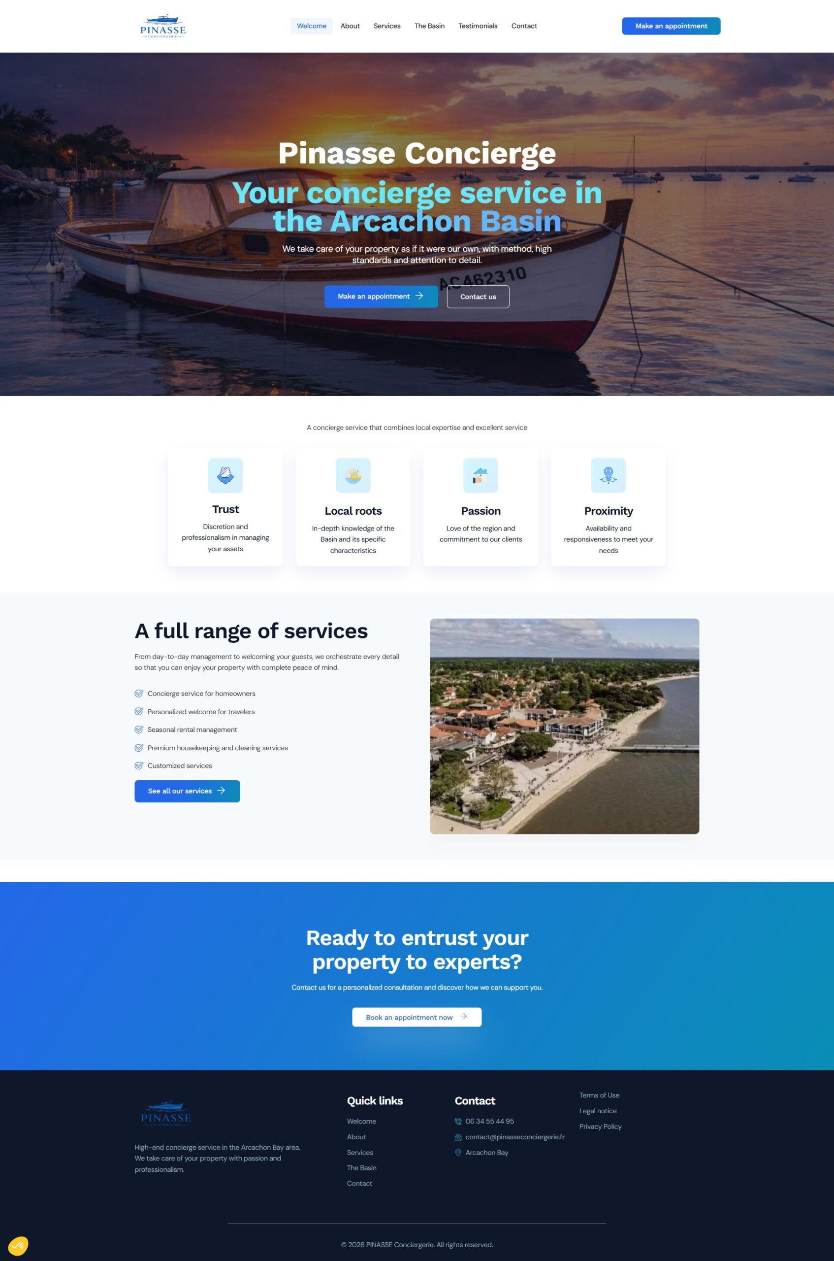 Pinasse Conciergerie is a service-based website built to showcase a concierge company focused on property management, guest hospitality, and tailored support for homeowners and hosts in the short-term rental market. The objective was to create a digital presence that reflects trust, professionalism, and efficient service while making it simple for visitors to understand offerings and get in touch.